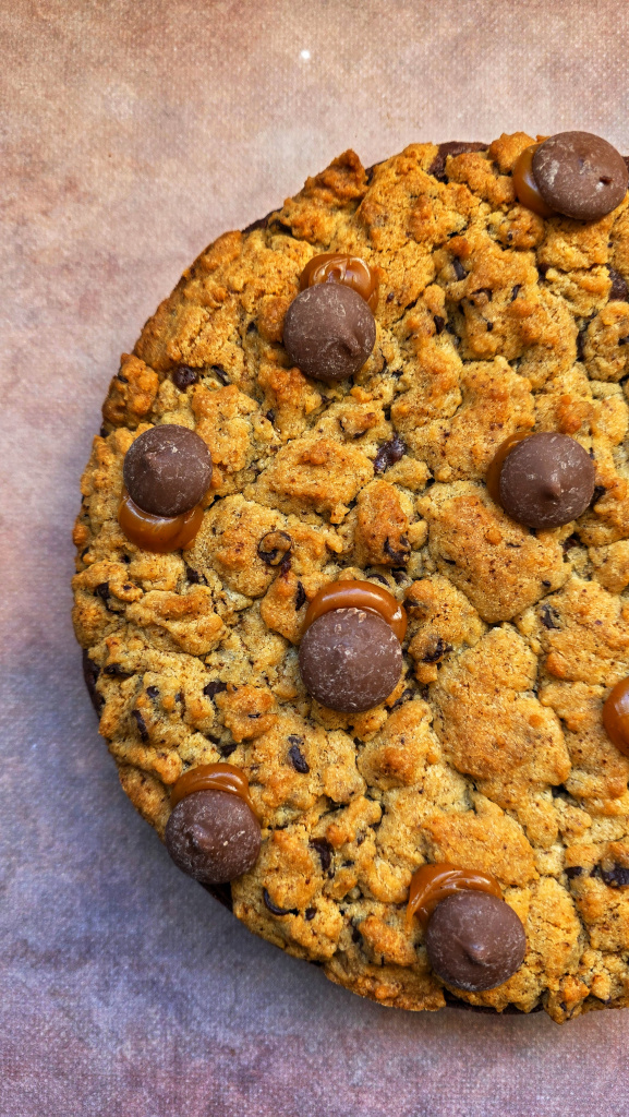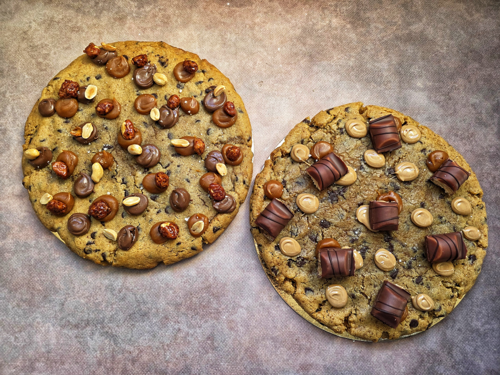 - Le cookie XXL (correspond au poids de 8/9 cookies standards) : pâte à cookie pépites de chocolat, caramel beurre salé, praliné noisette et noisettes torréfiées : format unique 22 euros