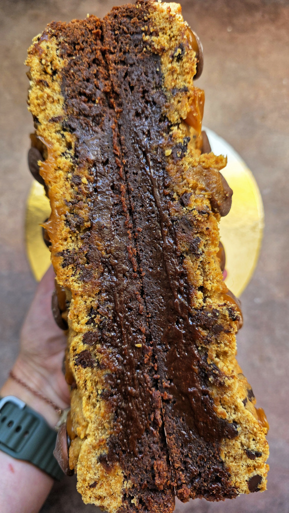 - Le brookie à partager (7/8 parts) : brownie au chocolat fondant & pâte à cookies croustillante, aux pépites de chocolat, points de caramel beurre salé 24 euros