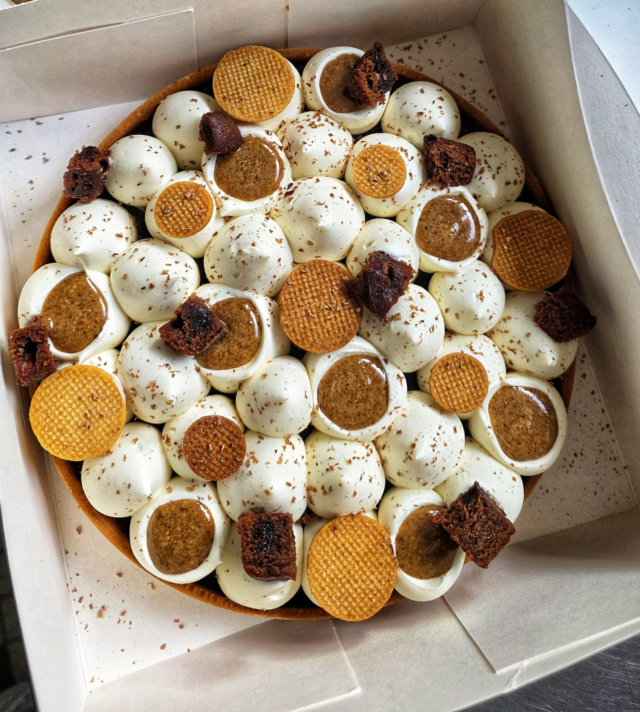- Le brookie à partager (7/8 parts) : brownie au chocolat fondant & pâte à cookies croustillante, aux pépites de chocolat, points de caramel beurre salé 23 euros